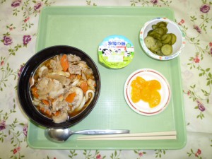 2017年11月9日(木) 2017/11/9 メニュー ◇けんちんうどん ◇胡瓜の酢の物 ◇フルーツ ◇ヨーグルト エネルギー585kcal たんぱく質24.4g 脂質16.1g 炭水化物82.0g 食塩4.2g