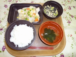 2010年10月31日(日) 2010/10/31 メニュー ◇御飯 ◇鶏肉のクリームソース ◇洋風サラダ ◇コンソメスープ エネルギー630kcal たんぱく質28.8g 脂質15.6g 炭水化物92.7g 塩分3.0g *参考*