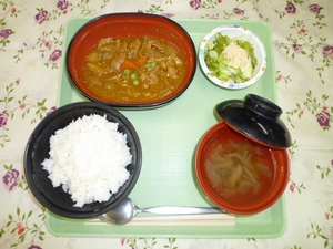 2012年11月28日(水) 2012/11/28 メニュー ◇御飯 ◇ポークカレー ◇グリーンサラダ ◇コンソメスープ エネルギー751kcal たんぱく質22.7g 脂質28.5g 炭水化物97.1g 塩分4.8g