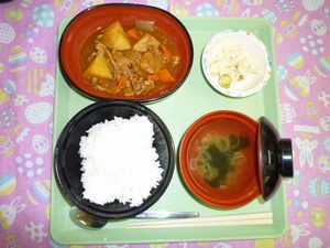 2018年4月28日(土) 2018/4/28 メニュー ◇御飯 ◇ビーフシチュー ◇イタリアンサラダ ◇コンソメスープ エネルギー717kcal たんぱく質21.0g 脂質25.0g 炭水化物98.5g 食塩4.1g