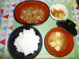2018年5月3日(木) 2018/5/3 メニュー, 豚肉 ◇御飯 ◇豚肉の豆板醤炒め ◇ごま醤油和え ◇味噌汁 エネルギー629kcal たんぱく質21.9g 脂質16.2g 炭水化物96.0g 食塩2.7g