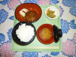 2018年6月5日(火) 2018/6/5 メニュー, 牛肉, 豚肉 ◇御飯 ◇ハンバーグデミソース ◇アスパラサラダ ◇コンソメスープ エネルギー614kcal たんぱく質20.0g 脂質12.2g 炭水化物104.8g 食塩3.5g