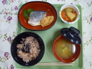 ◇赤飯 ◇鰆の西京焼き ◇肉じゃが ◇味噌汁 エネルギー637kcal たんぱく質30.5g 脂質13.9g 炭水化物89.1g 塩分3.7g