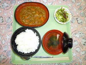 2018年7月27日(金) 2018/7/27 メニュー, 牛肉 ◇御飯 ◇ビーフカレー ◇グリーンサラダ ◇コンソメスープ エネルギー676kcal たんぱく質19.1g 脂質22.2g 炭水化物95.5g 食塩4.3g
