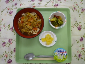 2013年1月31日(木) 2013/1/31 メニュー ◇カレーうどん ◇和風ブロッコリーサラダ ◇フルーツ缶 ◇ヨーグルト エネルギー641kcal たんぱく質24.4g 脂質20.3g 炭水化物91.1g 塩分3.7g