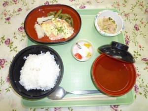 2013年3月2日(土) 2013/3/2 イベントメニュー ◇御飯 ◇鮭のマヨネーズ焼き ◇香味サラダ ◇トマトスープ ◇プリンアラモード エネルギー738kcal たんぱく質29.9g 脂質23.3g 炭水化物101.6g 塩分3.6g
