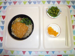 2019年5月9日(木) 2019/5/9 メニュー, 豆腐 ◇きつねそば ◇いんげんの胡麻和え ◇フルーツ エネルギー507kcal たんぱく質18.6g 脂質10.4g 炭水化物87.0g 食塩3.2g