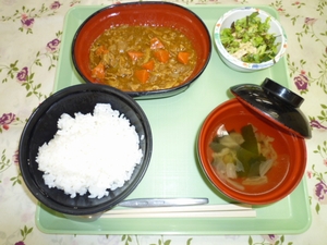 2013年3月13日(水) 2013/3/13 メニュー ◇御飯 ◇ポークカレー ◇グリーンサラダ ◇コンソメスープ エネルギー747kcal たんぱく質22.2g 脂質28.4g 炭水化物95.9g 塩分4.8g