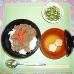 ◇牛丼 ◇オクラのおかか和え ◇味噌汁 エネルギー698kcal たんぱく質26.7g 脂質2...