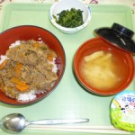 ◇牛焼肉丼 ◇ほうれん草の胡麻和え ◇味噌汁 ◇ヨーグルト エネルギー750kcal たんぱく質32.9g 脂質21.5g 炭水化物1...