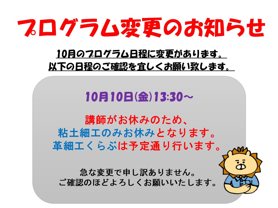 10月10日(金)プログラム変更のお知らせ 2025/9/27 外来作業療法ご案内, 外来作業療法プログラム予約 みなさん、こんにちは。 久喜すずのき病院 作業療法士の梶山です。 10月のプログラム変更のお知らせです。 突然の連絡になり、大変申し訳ございません。 ご迷惑おかけしますが、ご理解ご協力をお願いいたします。