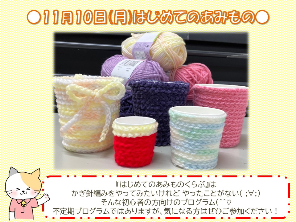 さて、11月10日(月)に行ったはじめてのあみものくらぶのご報告です。