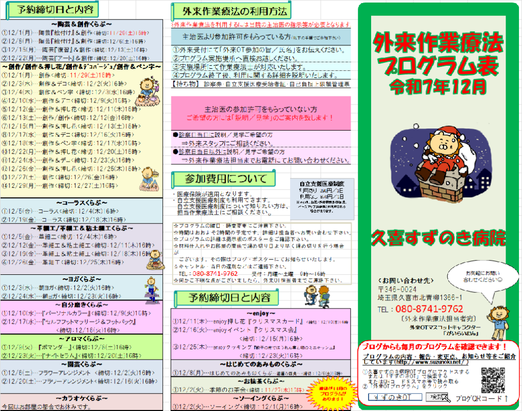 以上のような目的でご利用頂ければと思っておりますが、作業療法を行うか、どのように行うかは、あくまで皆様とご相談の上、決めていければと考えております。 作業療法をご利用頂くには、主治医の指示箋が必要ですので、ご希望の場合は主治医にご相談お願い致します。見学も御受け致します。