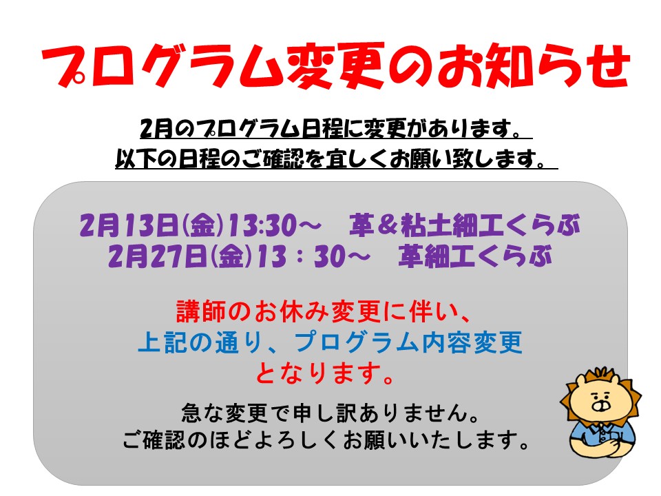 2月のプログラム変更のお知らせ 2026/1/30 外来作業療法ご案内 みなさん、こんにちは。 久喜すずのき病院 作業療法士の梶山です。 2月のプログラム変更のお知らせです。 突然の連絡になり、大変申し訳ございません。 ご迷惑おかけしますが、ご理解ご協力をお願いいたします。